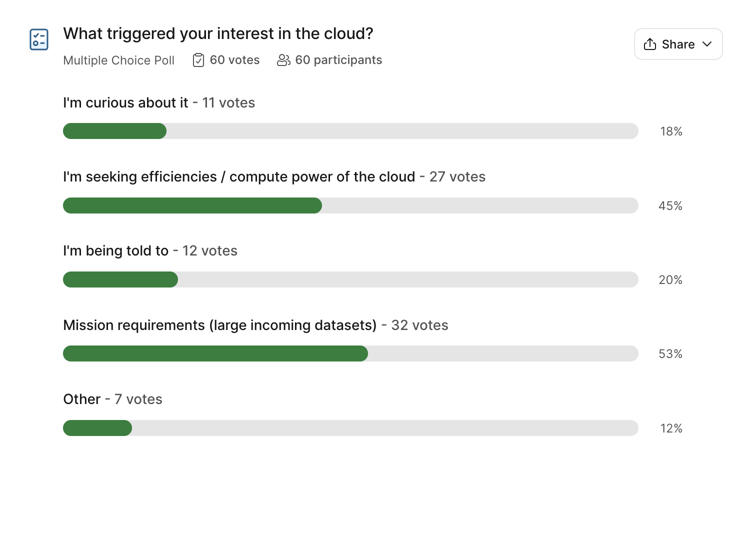 Participants in the room self-identified as Cloud enablers/facilitators (60%), as well as Cloud users (35%) and neither (27%).
